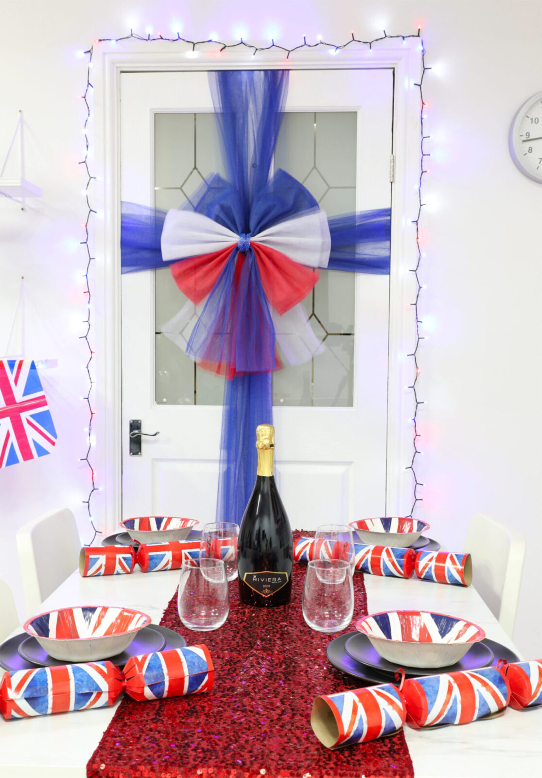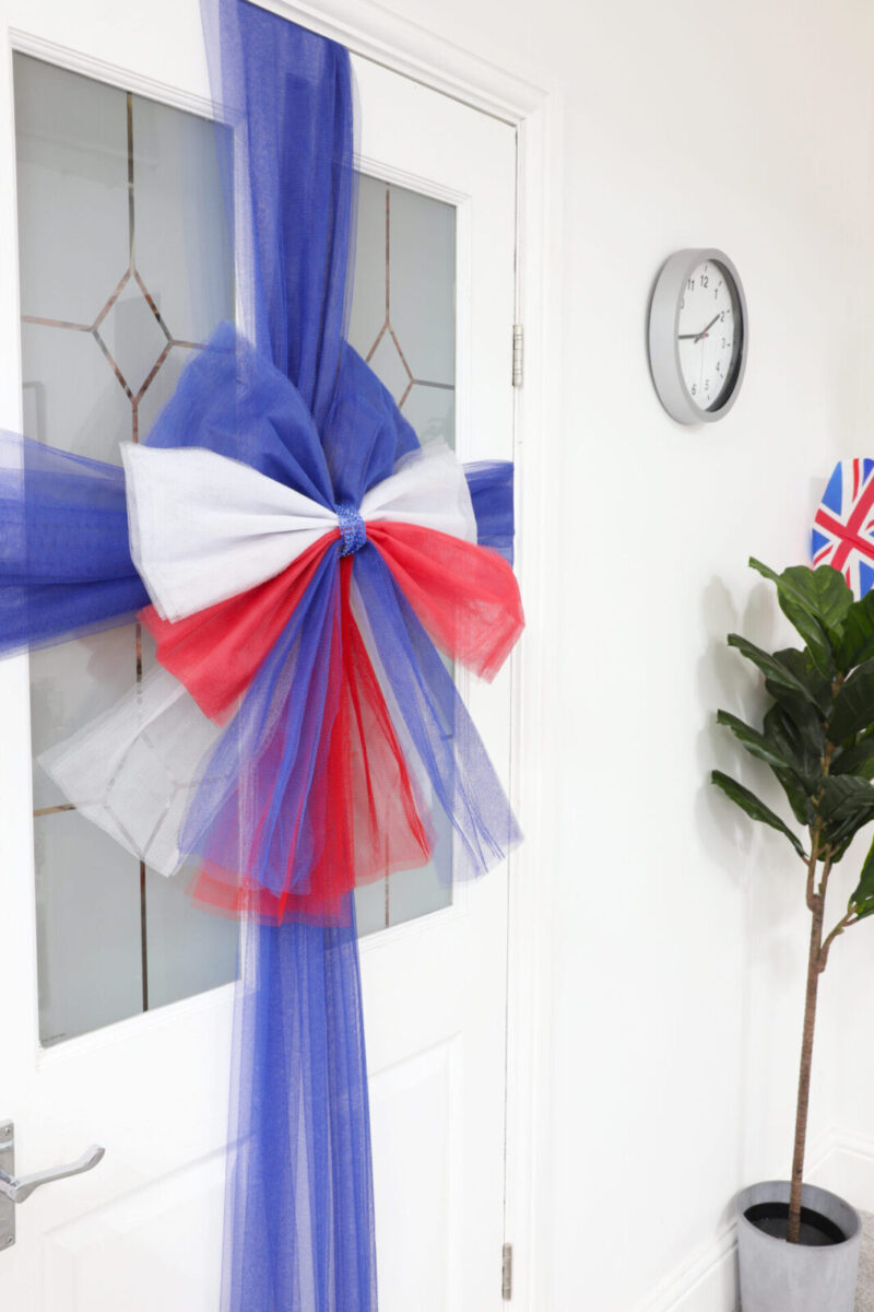 - The door bow is red, white and blue, all the Union Jack colours!. The bow features diamantes which makes the decoration even more fabulous!