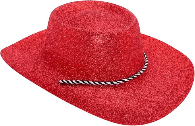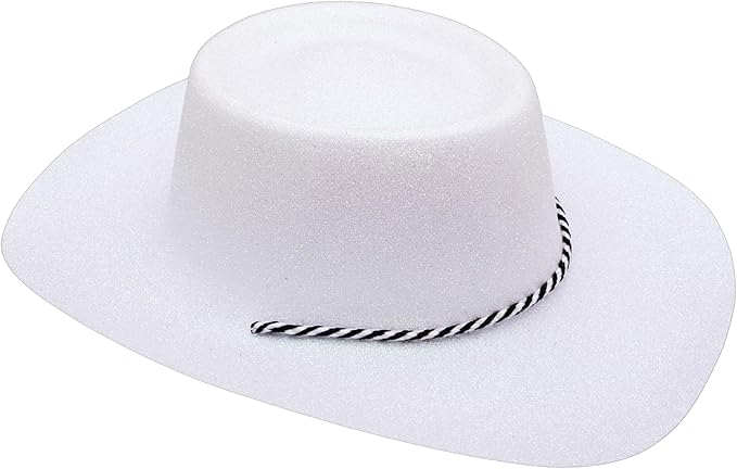 - You will get 9 glitter cowboy hats and 1 Football in the country design of your choice. Each hat comes with a black and white string attachment to secure the hat to your head and comes decorated in high quality glitter.