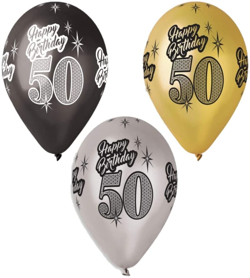 33cm (13″) Pack of 10 – Metallic Latex Balloons Gold, Silver & Black with Happy 50th Birthday Message – Party Decorations