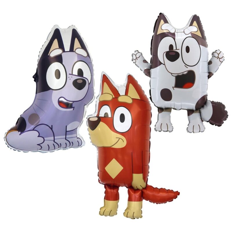 Pack Of 3 Bluey Foil Balloons – 29″ Muffin, 30″ Socks & 34″ Rusty – Kids Party Decorations