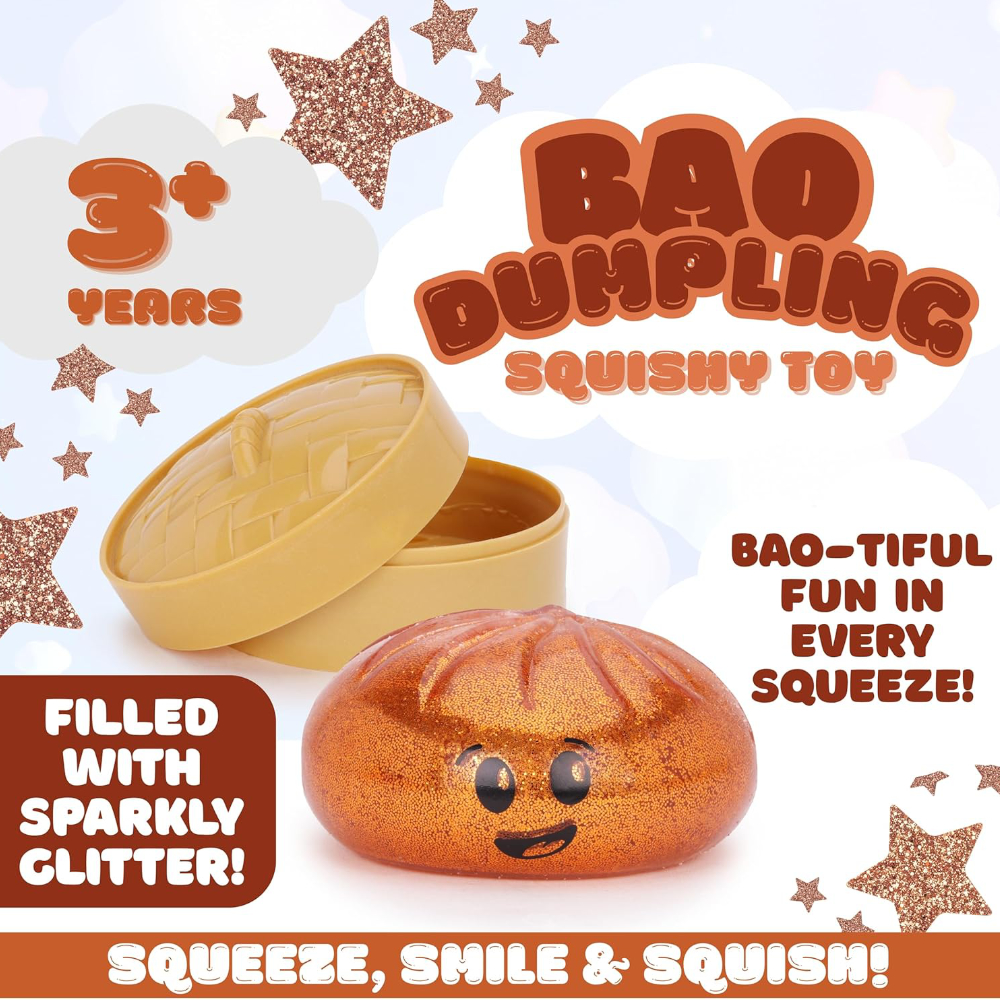 - Bao-tiful fun in every squeeze, shaped like a cute bao dumpling and packaged in a reusable plastic steamer box, it delivers satisfying squish with irresistible charm.