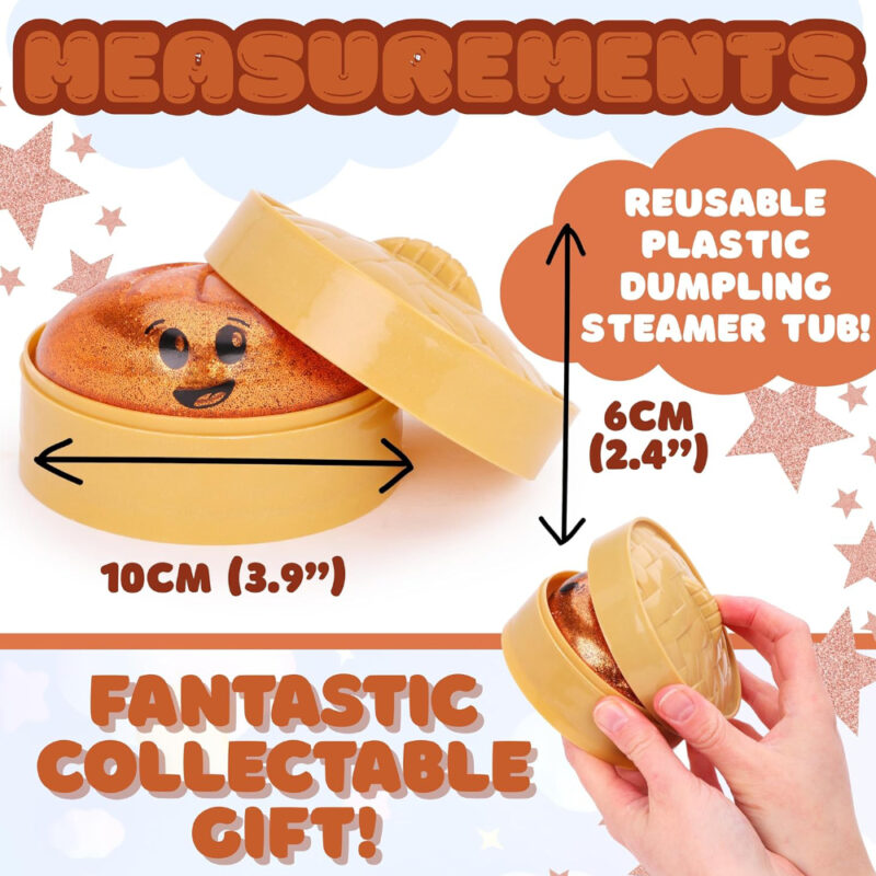 - The bao dumpling measures approximately 8cm (3.1″) in length, and 10cm (3.9″) when packaged inside the reusable plastic steamer box. Perfect for gifting, collecting, party bags, or everyday fidget fun. Suitable for ages 3+.